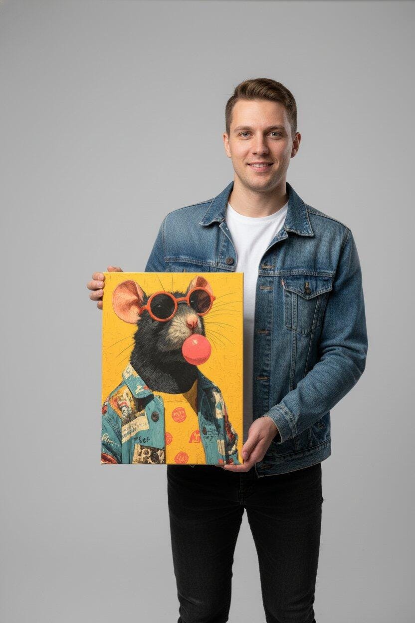 Un rat stylé en plein shoot de cool : grosses lunettes rondes orange, bulle rose XXL et veste turquoise patchée sur fond jaune punchy. Graphisme ciselé, texture “peinture” et vibes skate-shop / galerie urbaine. Impossible à rater. Impossible à oublier.